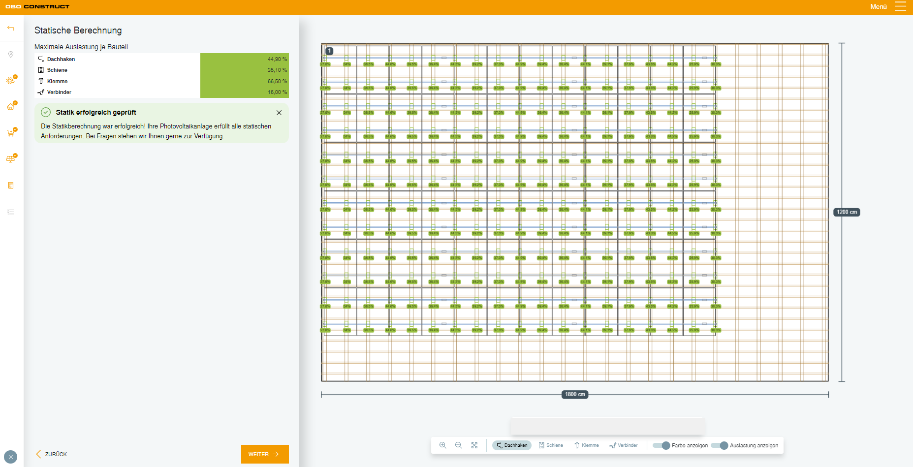 Vytvorte si svoj PV projekt online, upravujte ho a uložte si svoje plánovanie. Náš nástroj automaticky vypočíta potrebné množstvo jednotlivých komponentov a na základe plánovania vygeneruje grafiku nosnej konštrukcie a plánovania modulov. Dokumenty vrátane výkazov výmer a rôznych podkladov pre statické výpočty našej montážnej konštrukcie si môžete jednoducho stiahnuť vo viacerých formátoch súborov.