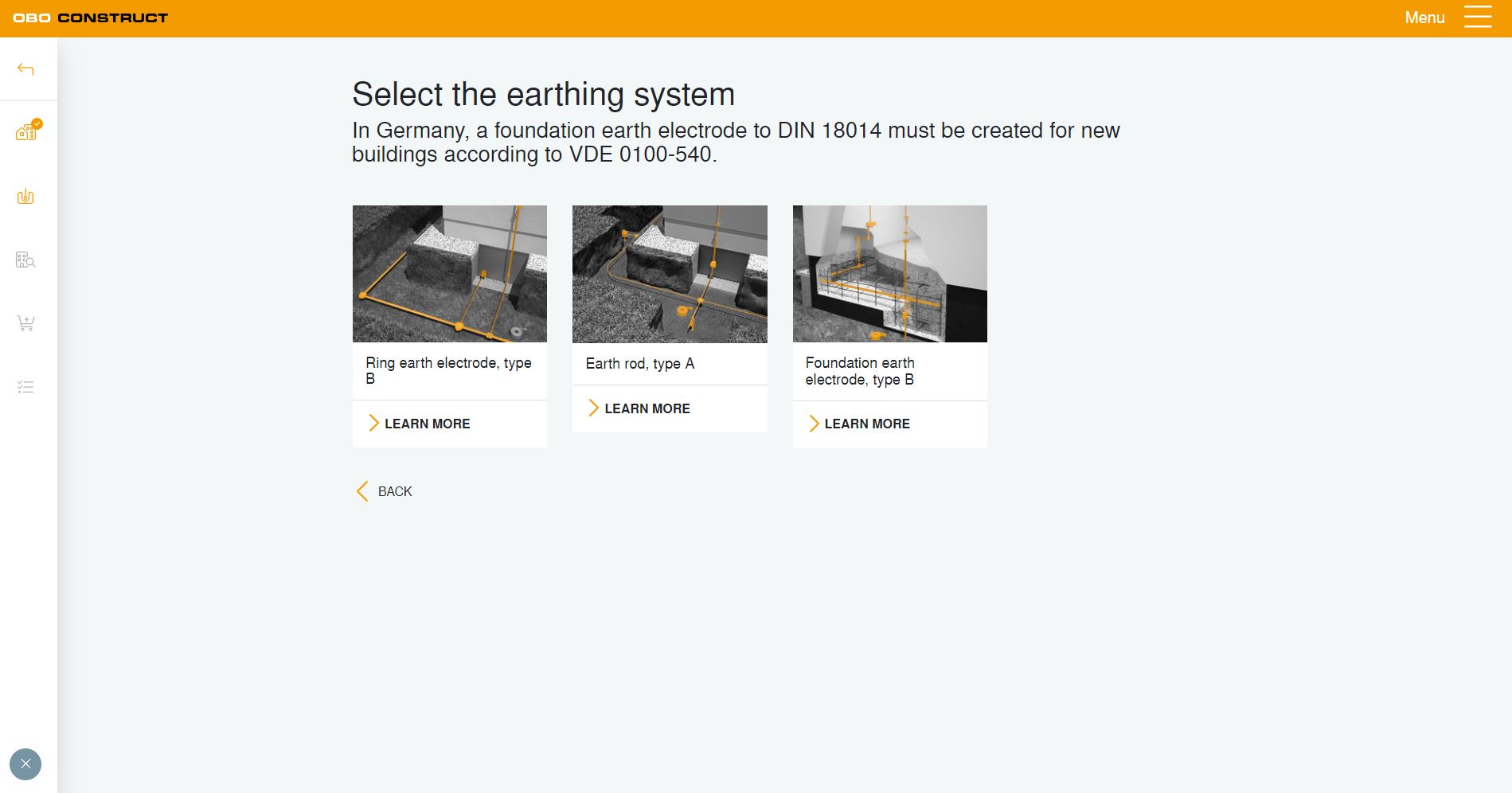 Pomocou aplikácie OBO Construct pre uzemňovacie systémy si môžete jednoducho a rýchlo naprojektovať a nakonfigurovať Váš uzemňovací systém. Jednoduchá a intuitívna navigácia pre používateľa vám umožní krok za krokom prechádzať jednotlivými komponentmi uzemňovacej sústavy.