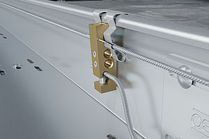 The screwless integration into the functional equipotential bonding is now possible with the KFL clamp spring and AKL connection terminal. The clamping spring is simply clamped onto the cable tray rail and guides the conductor rope along the cable tray. The connection clamp can be used to form any number of exits and branches.