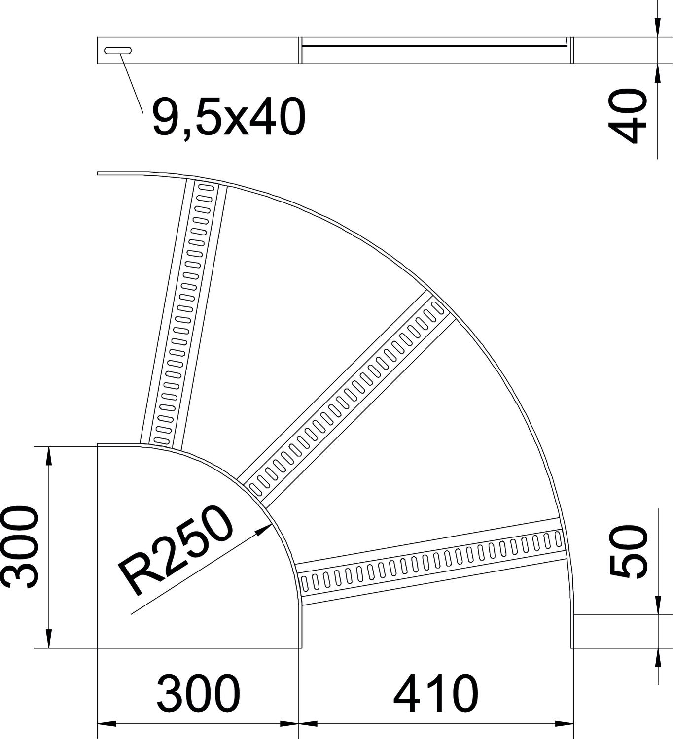 Popis produktuOblouk 90° pro kabelové žebříky pro stavbu lodí typu SL 62 s výškou bočnice 40 mm, s přivařenými dolů otevřenými a děrovanými trapézovými příčkami.