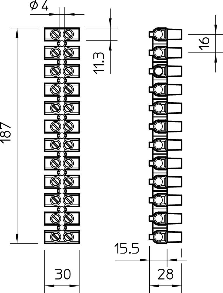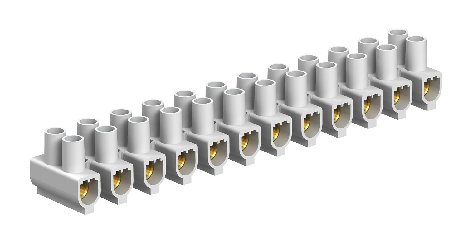 Svorky z mosazi, šrouby z oceli, galvanicky zinkované a transparentně pasivované, 12pólové, po jednotlivých svorkách oddělitelné lišty.