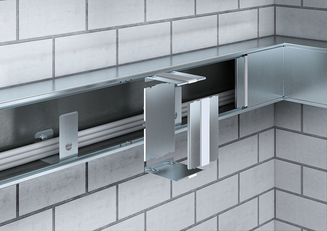 Inštalácia a montáž so systémom PYROLINE® Rapid PLM sú mimoriadne flexibilné a estetické: Okrem bežného druhu montáže s presadením medzi spojom vane kanála a spojom veka kanála je možné pomocou patentovanej spojovacej techniky realizovať aj montáž do rohu v miestnosti alebo nulový odstup medzi dvoma kanálmi. Súpravy spojok sú určené na montáž bez náradia, takže už nebudete potrebovať dodatočné skrutky ani upevnenia na podklad.
