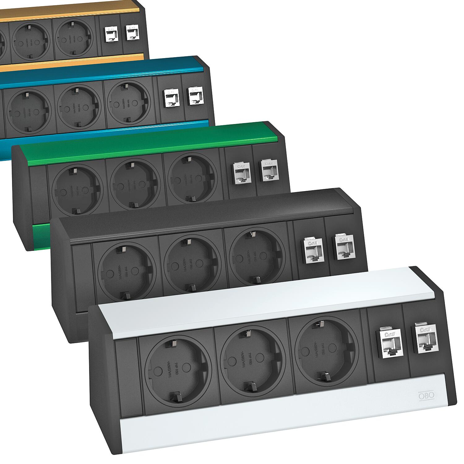 - Tři černé zásuvky s ochranným kontaktem a pootočením o 0°, vč. síťového kabelu o délce 3,0 m s úhlovou zástrčkou CEE 7/7.