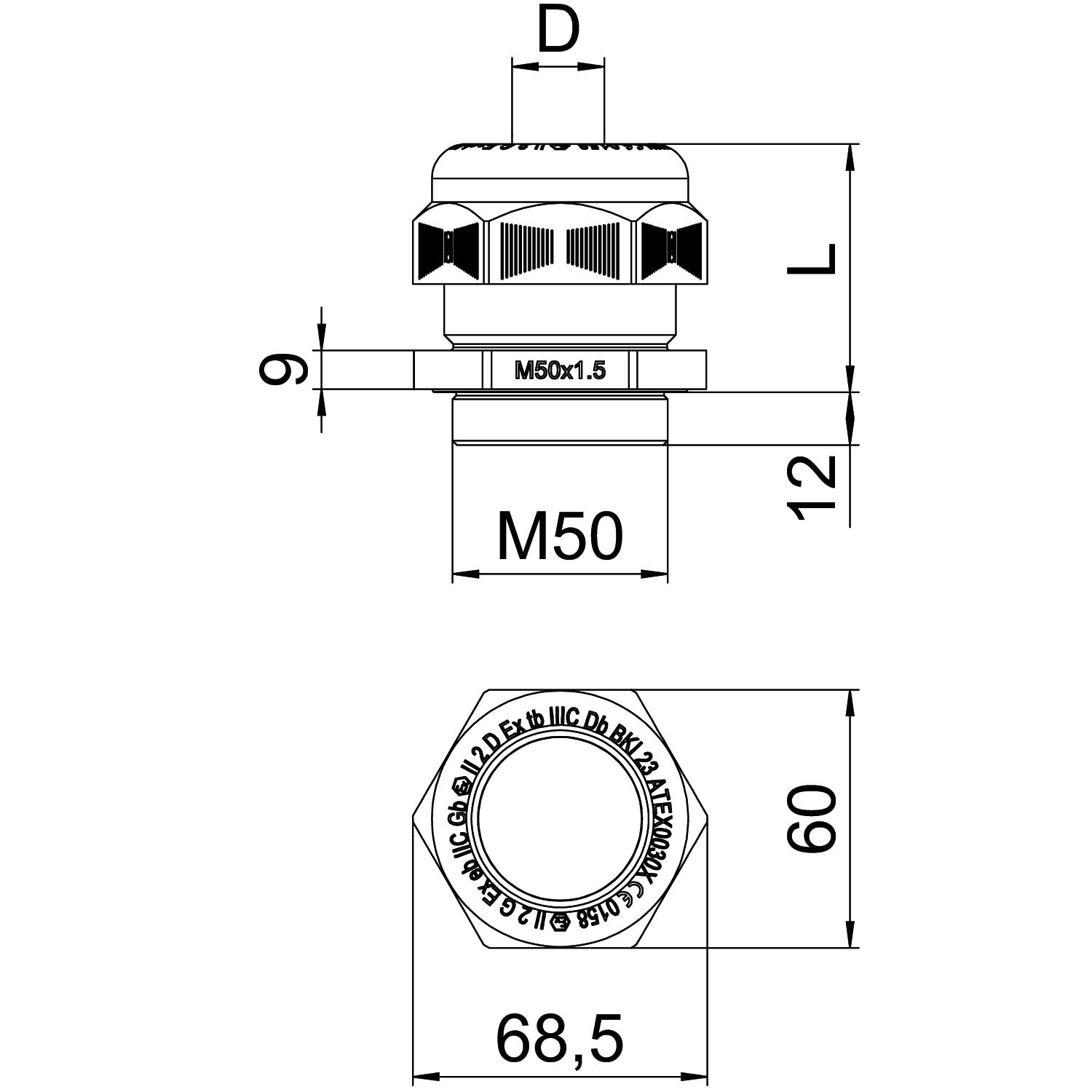 Bezhalogénový áno CO2 stopa (GWP) od kolísky po bránu 0,4032 kg CO2e / 1 Kus Dĺžka závitu 13 mm Druh tesnenia Tesniaci krúžok Druh závitu metrický Farba čierna Materiál Polyamid Menovitá veľkosť závitu 50 Možnosť odľahčenia od ťahu nie Nárazuvzdorný nie Nestabilný uťahovací moment 17 Nm Oblasť utesnenia D max. 38 mm Oblasť utesnenia D min. 32 mm Ochrana proti ohybu nie pre zónu Ex yes pre zónu Ex plyn 1, 2 pre zónu Ex prach 21, 22 Priechodka pre plochý kábel nie Rozmer M50 Rozmer E 68,5 mm Rozmer G M50 mm Rozmer L max. 57 mm Rozmer L min. 42 mm Rozmer L1 13 mm Rozmer L2 9 mm Rozpojiteľný skrutkový spoj nie S kontramaticou nie s ochranou proti výbuchu áno Šesťhran rozmer cez hrany 68,5 mm Stúpanie závitu 1,5 mm Stupeň krytia IP68 Teplotný rozsah použitia max. 65 °C Teplotný rozsah použitia min. -20 °C Veľkosť kľúča 60 Viacnásobná tesniaca vložka nie Vyhotovenie rovný Vystužený skleným vláknom nie Závit M50 x 1,5 - Všetky typy