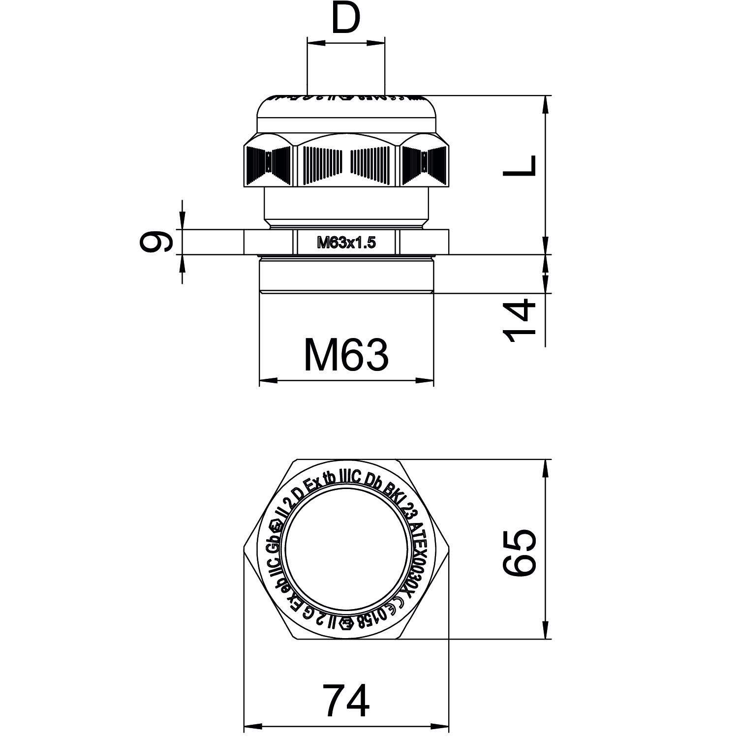 Bezhalogénový áno CO2 stopa (GWP) od kolísky po bránu 0,4471 kg CO2e / 1 Kus Dĺžka závitu 14 mm Druh tesnenia Tesniaci krúžok Druh závitu metrický Farba čierna Materiál Polyamid Menovitá veľkosť závitu 63 Možnosť odľahčenia od ťahu nie Nárazuvzdorný nie Nestabilný uťahovací moment 22 Nm Oblasť utesnenia D max. 44 mm Oblasť utesnenia D min. 36 mm Ochrana proti ohybu nie pre zónu Ex yes pre zónu Ex plyn 1, 2 pre zónu Ex prach 21, 22 Priechodka pre plochý kábel nie Rozmer M63 Rozmer E 74 mm Rozmer G M63 mm Rozmer L max. 58 mm Rozmer L min. 42 mm Rozmer L1 14 mm Rozmer L2 9 mm Rozpojiteľný skrutkový spoj nie S kontramaticou nie s ochranou proti výbuchu áno Šesťhran rozmer cez hrany 74 mm Stúpanie závitu 1,5 mm Stupeň krytia IP68 Teplotný rozsah použitia max. 65 °C Teplotný rozsah použitia min. -20 °C Veľkosť kľúča 65 Viacnásobná tesniaca vložka nie Vyhotovenie rovný Vystužený skleným vláknom nie Závit M63 x 1,5 - Všetky typy