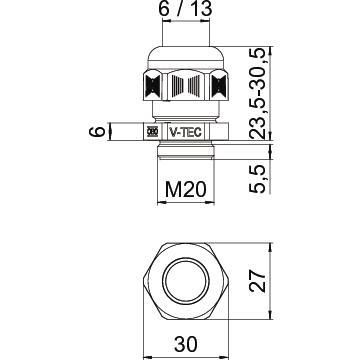 Bezhalogénový áno CO2 stopa (GWP) od kolísky po bránu 0,0658 kg CO2e / 1 Kus Dĺžka závitu 7 mm Druh tesnenia Tesniaci krúžok Druh závitu metrický Farba svetlosivá; RAL 7035 Materiál Polyamid Menovitá veľkosť závitu 20 Možnosť odľahčenia od ťahu áno Nárazuvzdorný nie Oblasť utesnenia D max. 14 mm Oblasť utesnenia D min. 7 mm Ochrana proti ohybu nie ohňovzdorný podľa VDE 0471/DIN 695 časť 2-1, skúšobná teplota 650°C pre zónu Ex bez pre zónu Ex plyn bez pre zónu Ex prach bez Priechodka pre plochý kábel nie Rozmer M20 Rozmer L max. 33 mm Rozmer L min. 25 mm Rozmer L1 7 mm Rozmer L2 6 mm Rozmer L3 19 mm Rozpojiteľný skrutkový spoj nie S kontramaticou nie s ochranou proti výbuchu nie Šesťhran rozmer cez hrany 27 mm Stúpanie závitu 1,5 mm Stupeň krytia IP68 Teplotný rozsah použitia max. 65 °C Teplotný rozsah použitia min. -20 °C Veľkosť kľúča 27 Viacnásobná tesniaca vložka nie Vyhotovenie rovný Vystužený skleným vláknom nie Závit M20 x 1,5 - Všetky typy