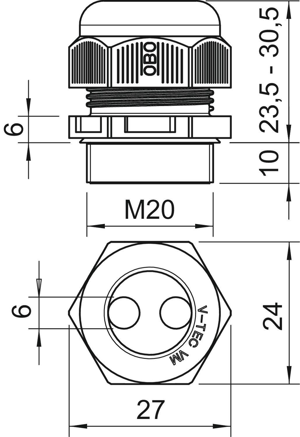 Popis produktuKabelová vývodka s metrickým připojovacím závitem kloboučkového tvaru, pro odbočné krabice, pouzdra, rozvodné skříně v soukromé i průmyslové oblasti. S odlehčením tahu a integrovaným těsnicím břitem, zkoušena podle normy EN 62444. Stupeň krytí IP68. Lze použít od –20 °C do +65 °C.