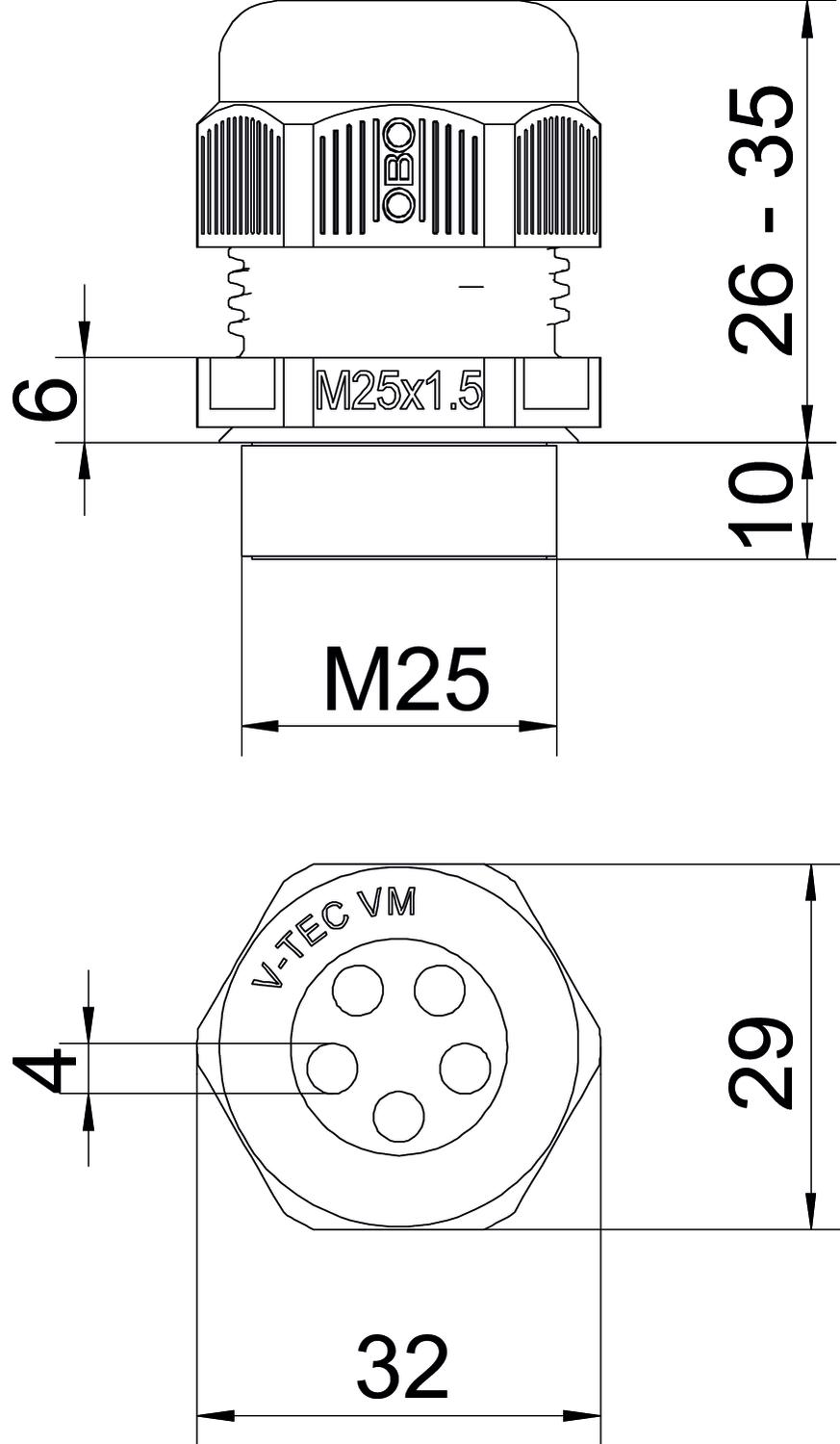 Bezhalogénový áno CO2 stopa (GWP) od kolísky po bránu 0,0608 kg CO2e / 1 Kus Dĺžka závitu 10 mm Druh tesnenia Tesniaci krúžok Druh závitu metrický Farba svetlosivá Materiál Polyamid Menovitá veľkosť závitu 25 Možnosť odľahčenia od ťahu áno Nárazuvzdorný nie Nestabilný uťahovací moment 5 Nm Ochrana proti ohybu nie ohňovzdorný podľa VDE 0471/DIN 695 časť 2-1, skúšobná teplota 650°C Počet otvorov 5 pre zónu Ex bez pre zónu Ex plyn bez pre zónu Ex prach bez Priechodka pre plochý kábel nie Rozmer M25 Rozmer D 4 mm Rozmer E 32 mm Rozmer L max. 35 mm Rozmer L min. 26 mm Rozmer L1 10 mm Rozmer L2 6 mm Rozpojiteľný skrutkový spoj nie S kontramaticou nie s ochranou proti výbuchu nie Šesťhran rozmer cez hrany 32 mm Stúpanie závitu 1,5 mm Stupeň krytia IP68 Teplotný rozsah použitia max. 65 °C Teplotný rozsah použitia min. -20 °C Veľkosť kľúča 29 Viacnásobná tesniaca vložka áno Vyhotovenie rovný Vystužený skleným vláknom nie Závit M25 x 1,5 - Všetky typy