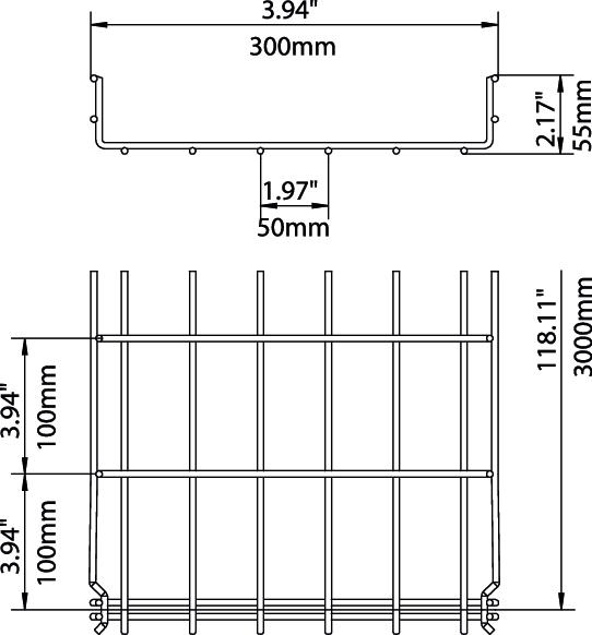 Pro mřížový žlab nejsou nutné žádné další spojovací prvky, díly se jednoduše navzájem zasunou. Rozměr ok je 50 x 100 mm (výjimka GRM 55/50 = 20 x 100 mm).