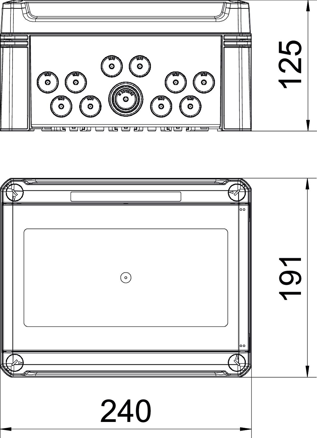 Minirozváděč na omítku, ochranná izolace pro max. 9 dílčích jednotek, na horní a dolní straně je po 9 vylamovacích otvorech (8× Ø 20 a 1× Ø 20/25/32) vč. předem namontované 35mm nosné profilové lišty. Čtyři dodávané šroubovací krytky zamezují nechtěnému „zavlečení napětí“.