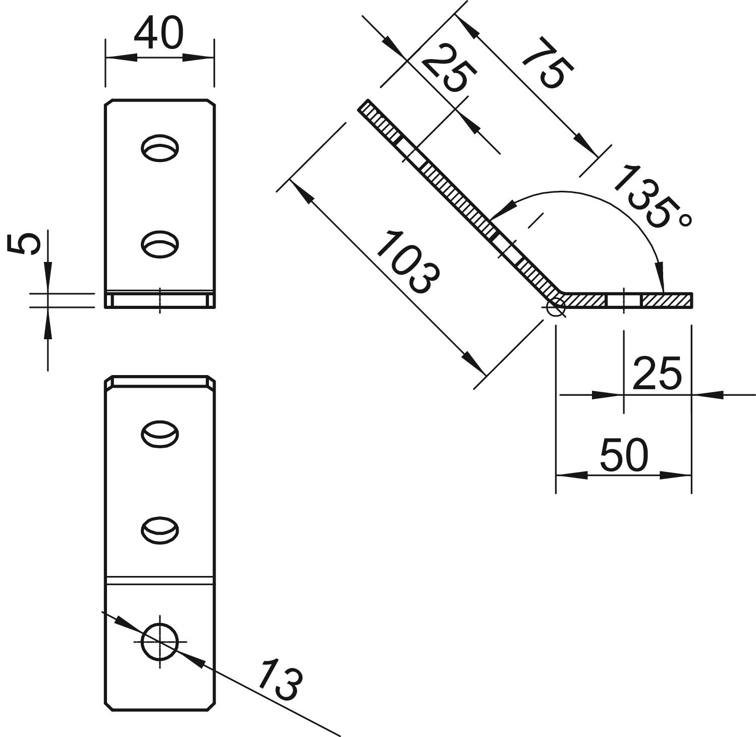 Popis produktuMontážní úhelník se třemi otvory pro spojení profilových lišt 41 × 41 mm a 41 × 21 mm v úhlu 45 stupňů.