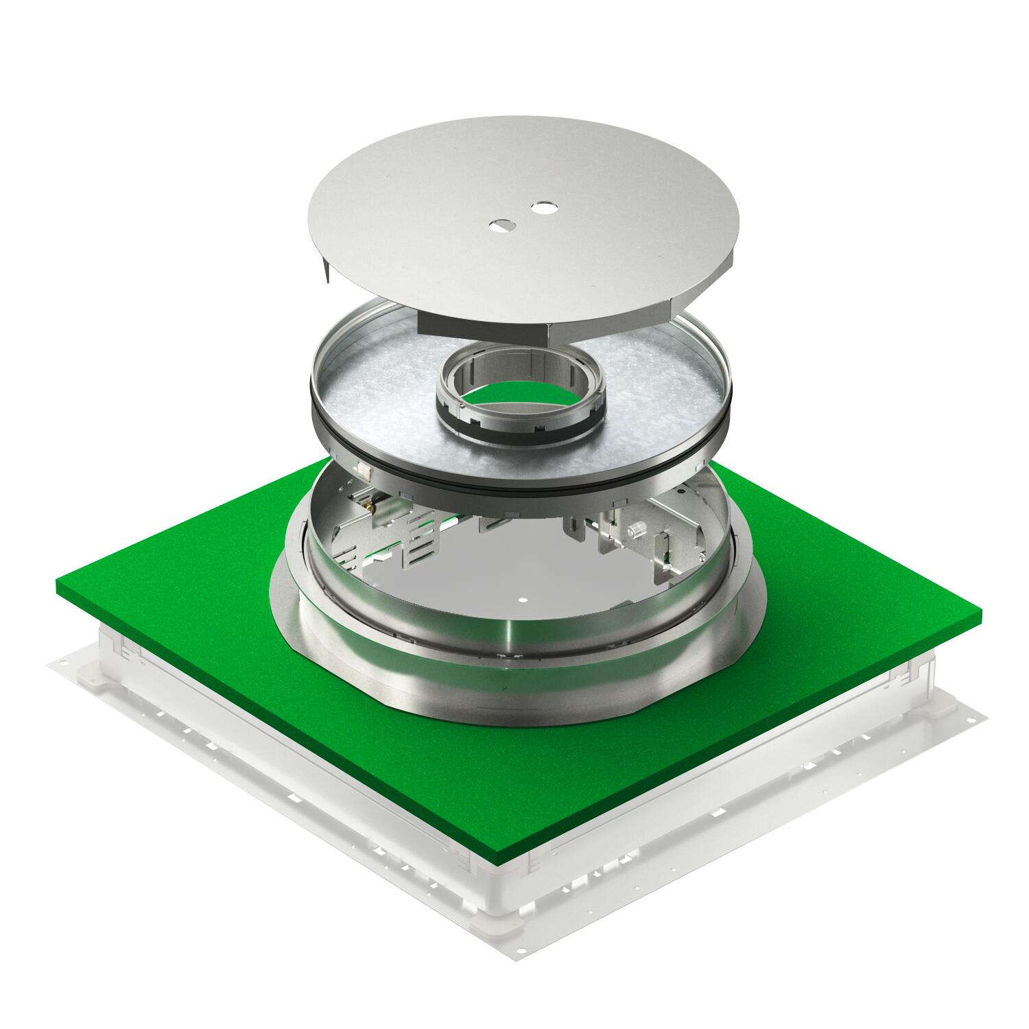 Nivellierbare Kassette mit Tubus. Für den Einbau von 3 Universalträgern UT4 für 9 Einzel-Installationsgeräte mit Tragering/Tragebügel oder 12 Modul 45®-Geräte. Im Lieferumfang enthalten sind ein Estrichschutzdeckel aus Aluminium (überschleifbar), ein passender Montagedeckel zur Fixierung des Kassetten-Schalkörpers und eine ISO-Schürze zur Entkopplung von der Unterflur-Anschlussdose.