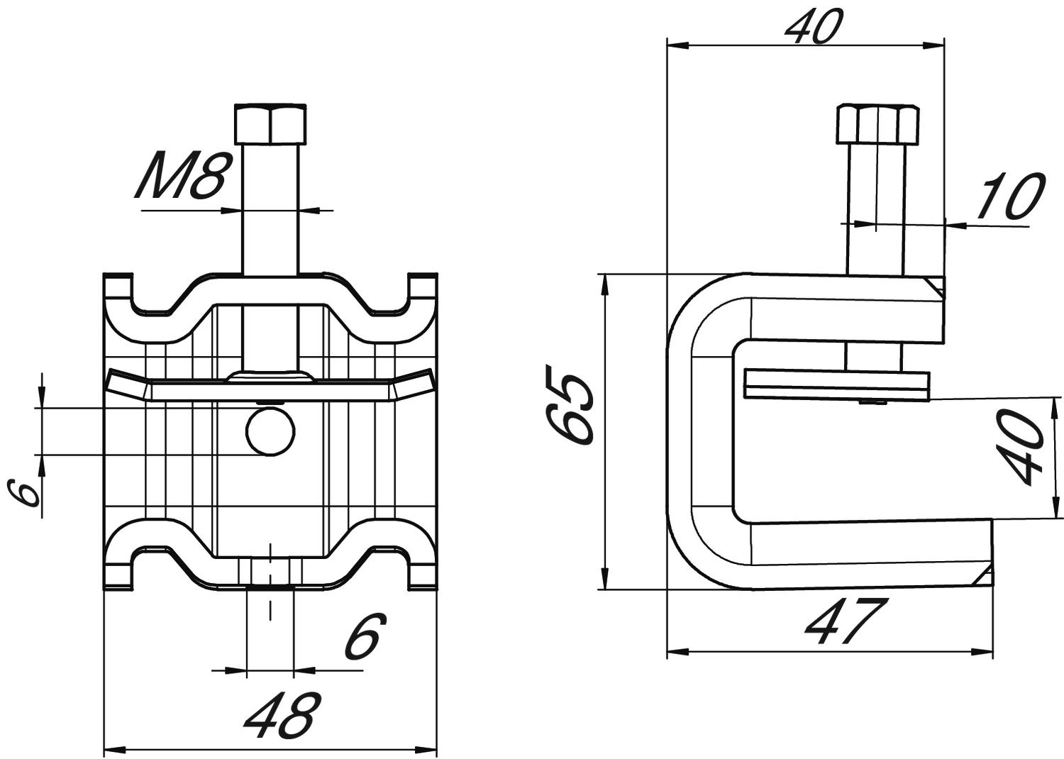 Popis produktuTento druh nosníkové svorky se nasouvá na nosník a k nosníku nebo ploché oceli se upevňuje prostřednictvím přítlačné opěrky a šroubu (M8). Šroub se šestihrannou hlavou má velikost 10 mm. V těle příchytky se mimoto nacházejí dva další závity M6 například k upevnění závitových tyčí.