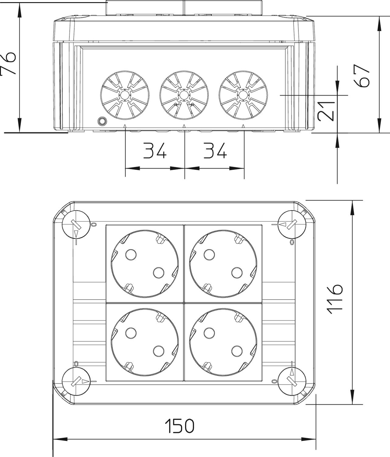 Popis produktuOdbočná krabice k propojení kabelů a vedení v interiéru a chráněném venkovním prostoru. Obdélníkové provedení s otvory k vyražení po stranách a ve dně. Vhodná pro montáž na stěnu či strop a k montáži na montážní plechy. S možností vnitřního upevnění a vnějšího upevnění při montáži pomocí rohových nálitků. Víko s rychlozavíráním, plombovatelné s ochranou proti ztrátě a se 4-mi zásuvkami Modul45. Vyrobeno z bezhalogenových materiálů stabilizovaných proti ultrafialovému záření.