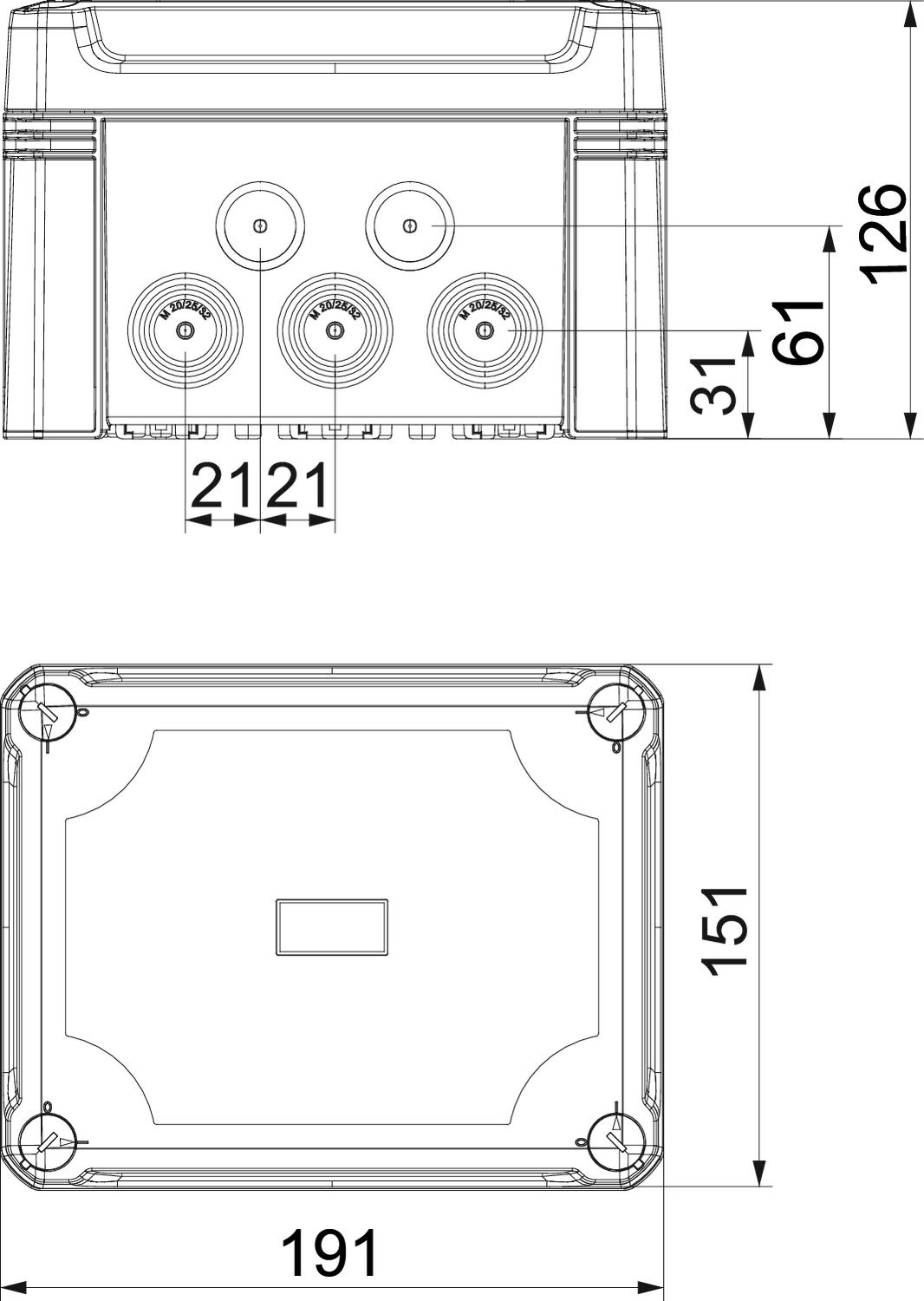 Popis produktuOdbočná krabice k propojení kabelů a vedení v interiéru a venkovním prostoru. Obdélníkové provedení s otvory k vyražení. Vhodná pro montáž na stěnu/strop s možností vnějšího upevnění, vnitřního upevnění nebo montáže pomocí rohových nálitků. Obzvláště odolná proti rázům s IK09. Víko s rychlouzávěrem, možnost zaplombování. Vyrobena z bezhalogenových materiálů odolných proti ultrafialovému záření.