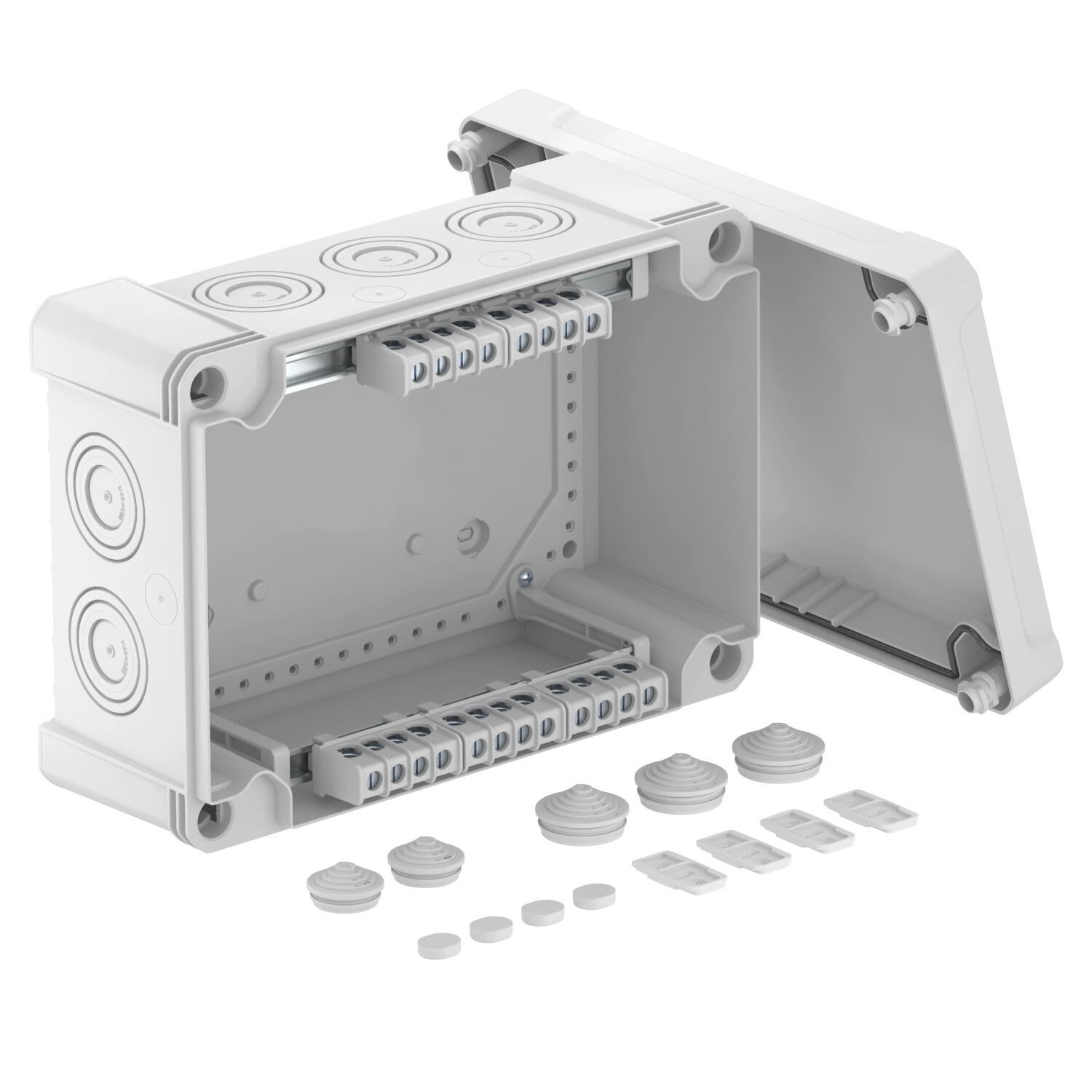 Popis produktuOdbočná krabice se svorkovnicí k propojení kabelů a vedení v interiéru a venkovním prostoru. Obdélníkové provedení s otvory k vyražení. Vhodná pro montáž na stěnu/strop s možností vnějšího upevnění, vnitřního upevnění nebo montáže pomocí rohových nálitků. Zvlášť odolná proti nárazu – IK08. Víko s rychlouzávěrem, možnost zaplombování. Vyrobena z bezhalogenových materiálů odolných proti ultrafialovému záření.
