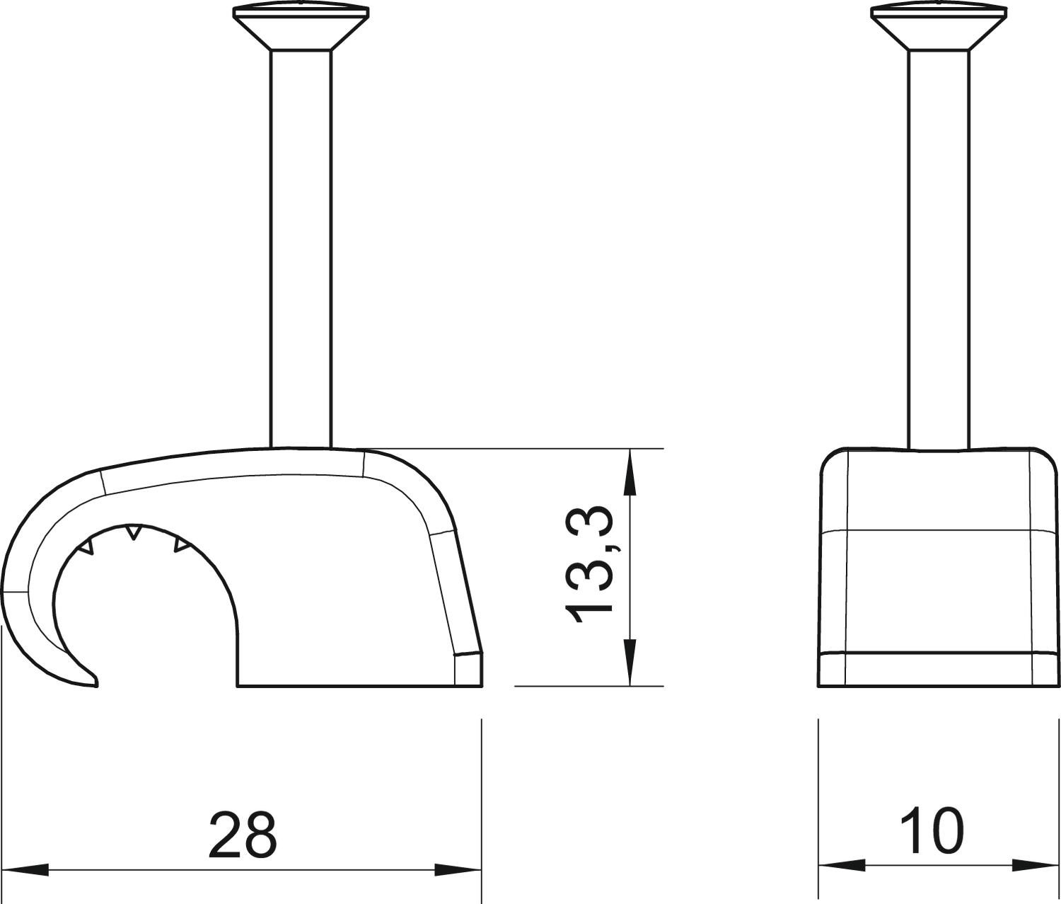 aretácia rúrky nie Bezhalogénový áno CO2 stopa (GWP) od kolísky po bránu 0,0057 kg CO2e / 1 Kus Dĺžka klinca 30 mm Dvojitá príchytka nie Farba svetlosivá; RAL 7035 Forma oblý (pre vedenie kruhového prierezu) Materiál Polypropylén Nárazuvzdorný áno pre priemer kábla max. 14 mm pre priemer kábla min. 10 mm pre priemer klinca 2,0 x 30 Rozmer 10-14mm, L30 Rozmer B 10 mm Rozmer H 13,3 mm Rozmer L 28 mm S klincom áno tvrdený áno - Všetky typy