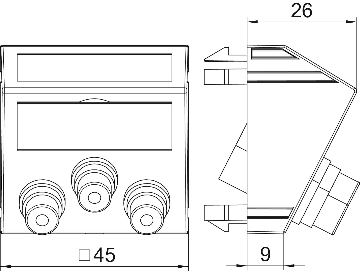Popis produktuMultimediální nosič se třemi zdířkami cinch pro audio a video, šikmý vývod kabelů, s popisovým polem, tři konektory cinch (RCA) v provedení zdířka-zdířka, barevné kódování: žlutá/červená/bílá. Nosná deska upevňovaná naklapnutím, vhodná pro vodorovnou i svislou montáž do systémového prostředí.
