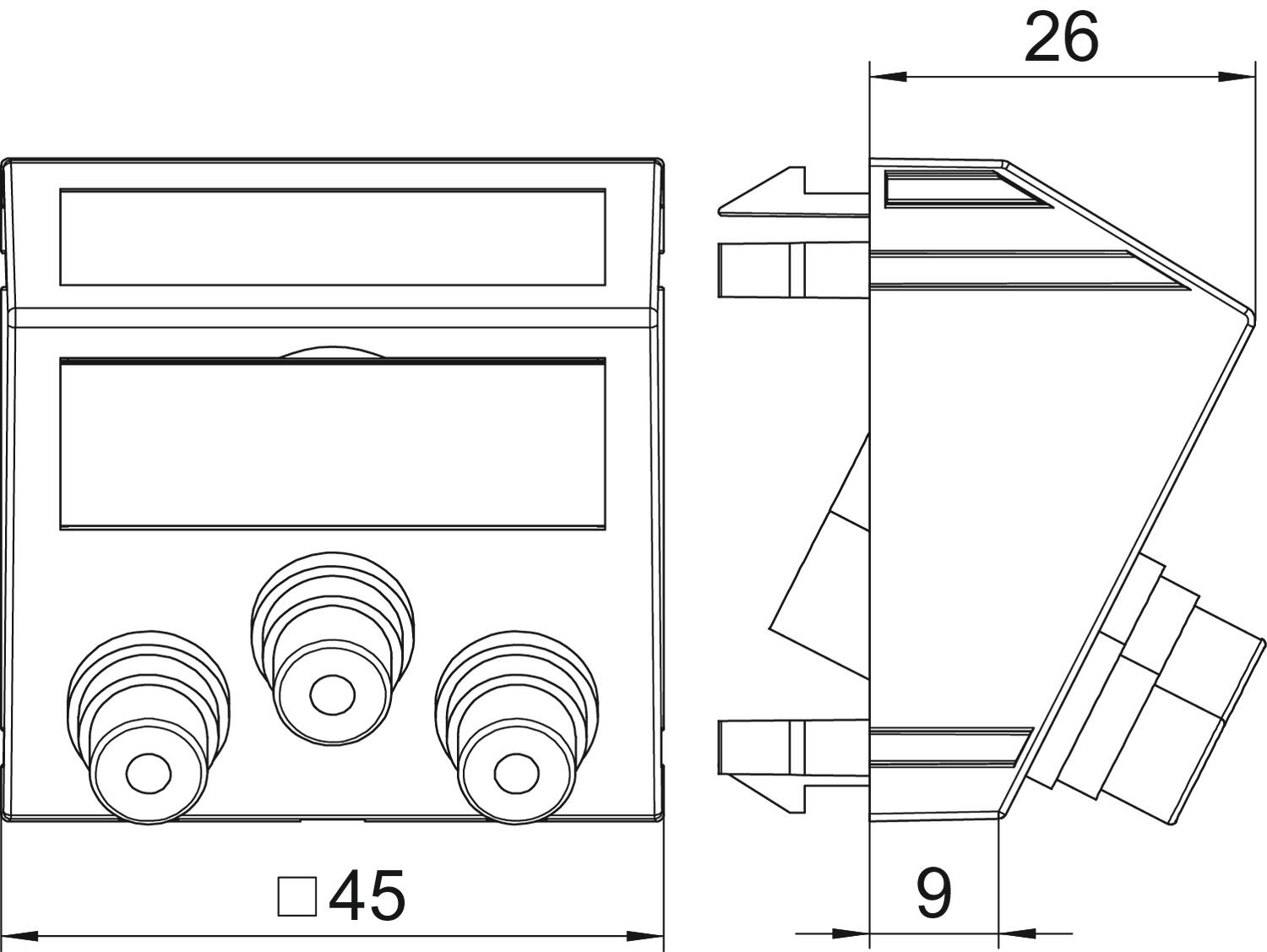 Popis produktuMultimediální nosič se třemi zdířkami cinch pro audio a video, šikmý vývod kabelů, s popisovým polem, tři zdířky cinch (RCA) s pájecím přívodem, barevné kódování: žlutá/červená/bílá. Nosná deska upevňovaná naklapnutím, vhodná pro vodorovnou i svislou montáž do systémového prostředí.