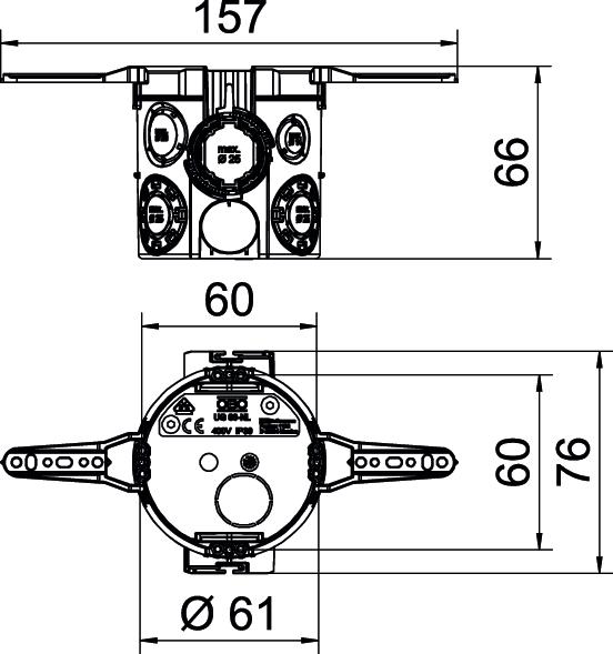 Popis produktuPřístrojová krabice pod omítku s hřebíkovými nálitky, pro použití ve zdivu s montážní hloubkou nejméně 66 mm.