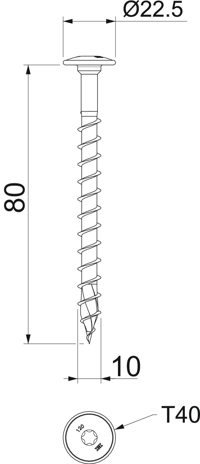 Dĺžka 80 mm Dvojcestný nie Farba pozinkováno Materiál Oceľ Povrch galvanicky zinkované Priemer hlavy 22,5 mm Priemer stĺpika 7 mm Rozmer 10x80 Rozmer D 10 mm Rozmer L 80 mm Skrutkový systém Torx Tvar hlavy Tanierová hlava tvrdený áno - Všetky typy