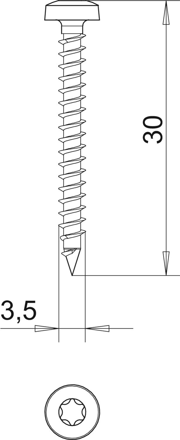 Dĺžka 30 mm Dvojcestný áno Hrúbka 3,5 mm Materiál Oceľ Povrch galvanicky zinkované Priemer hlavy 6,5 mm Rozmer 3,5x30mm Rozmer D 3,5 mm Rozmer L 30 mm Skrutkový systém Torx Tvar hlavy Panhead tvrdený áno - Všetky typy