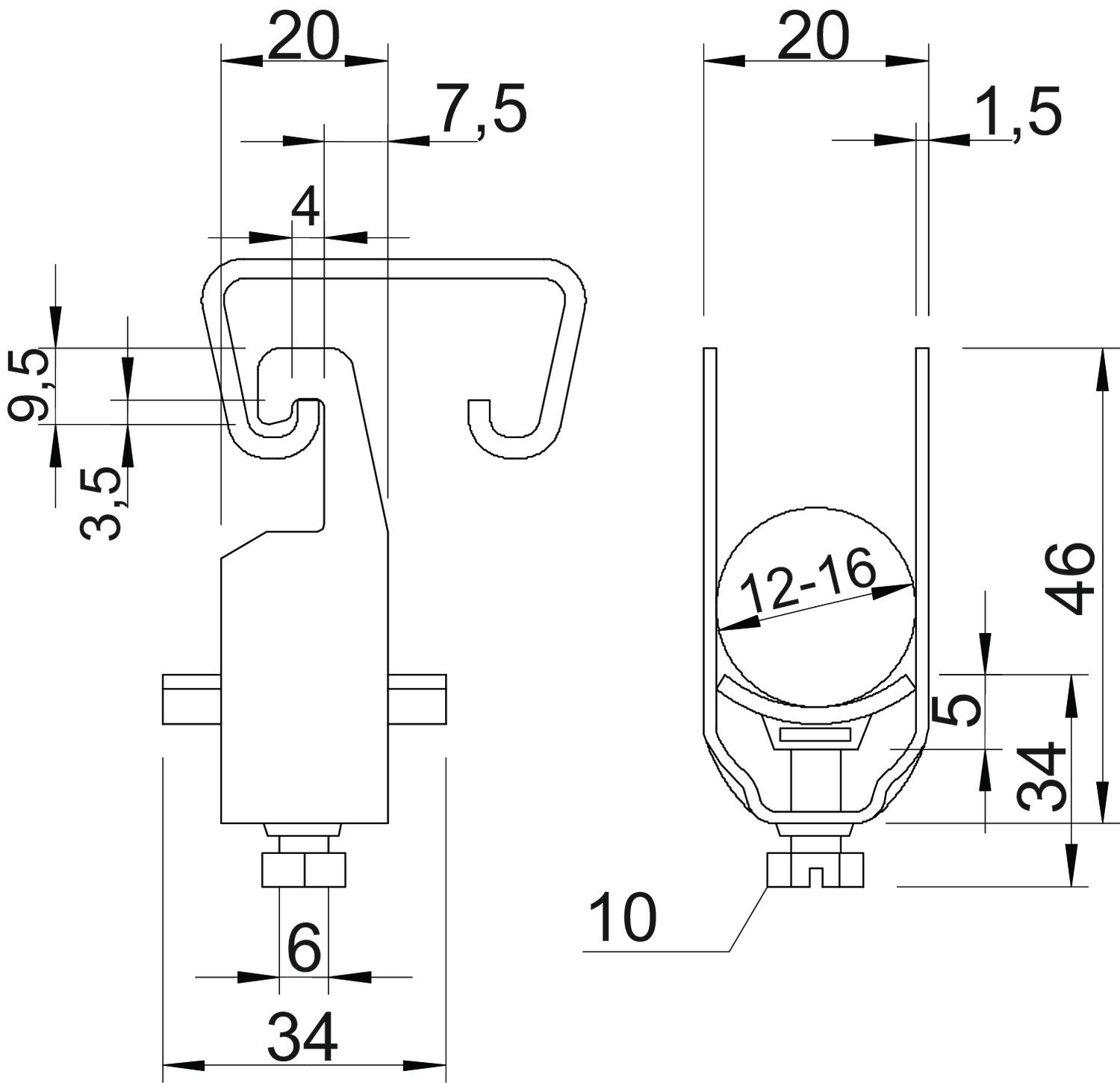 Bezhalogénový nie CO2 stopa (GWP) od kolísky po bránu 0,0657 kg CO₂e / 1 Kus Dodatok materiál Oceľ Dodatok povrch žiarivo zinkované Materiál Oceľ Materiál opierky Oceľ Max. uťahovací moment 3 Nm Nárazuvzdorný nie Počet káblov/rúr 1 Povrch žiarovo zinkované ponorením pre lištu so šírkou prieseku (s intervalom) max. 22 mm pre lištu so šírkou prieseku (s intervalom) min. 18 mm pre priemer rúrky max. 16 mm pre priemer rúrky min. 16 mm Rozmer 12-16mm Rozmer A 20 mm Rozmer B 20 mm Rozmer C 34 mm Rozmer G (mm) M6 Rozmer H 46 mm Rozmer L 34 mm Rozmer t 1,5 mm Rozmer x 5 mm Rozsah upínania D max. 16 mm Rozsah upínania D min. 12 mm S kovovou vaničkou áno S plastovou vaňou nie S pozdĺžnou opierkou nie Spôsob montáže Profilová lišta - Všetky typy