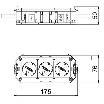 Propojený univerzální nosič UTC3 disponuje 2 bílými předinstalovanými zásuvkami s ochranným kontaktem 33° pro proud 16 A a jednou oranžovou předinstalovanou zásuvkou s ochranným kontaktem 33° pro proud 16 A.