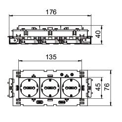Popis produktuZásuvka s ochranným kontaktem a bočním připojením Trojitá, 0°, se zvýšenou ochranou proti nebezpečnému dotyku a násuvnými svorkami, 2pól., 16 A, 250 V~, se spojovacími svorkami dle IEC 60884-1, vhodná k montáži do systémů kanálů pro vestavbu přístrojů Rapid 80.