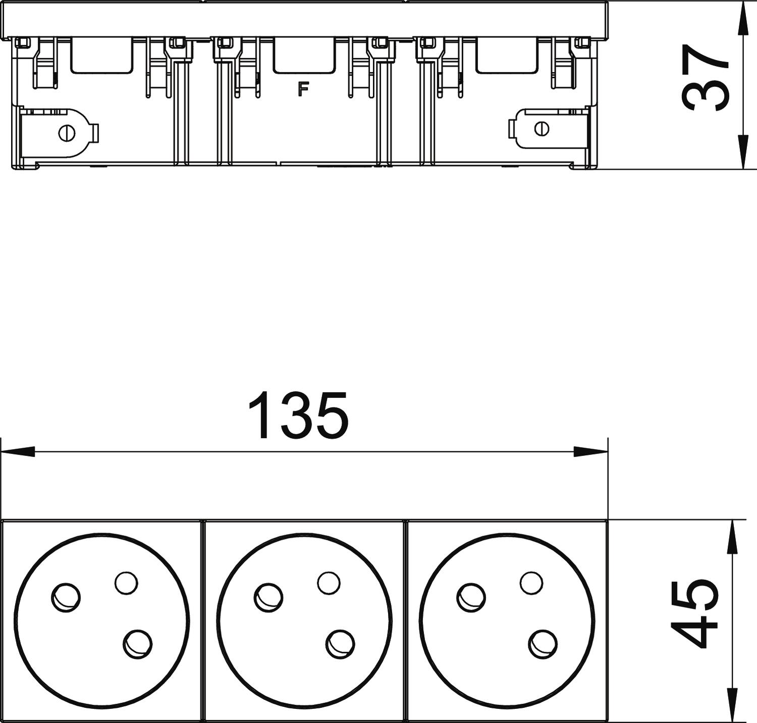 Popis produktuZásuvka se zemnicím kolíkem a bočním připojením Trojnásobná, 33°, se zvýšenou ochranou proti nebezpečnému dotyku a násuvnými svorkami, 2-pól., 16 A, 250 V~, se spojovacími svorkami dle IEC 60884-1.